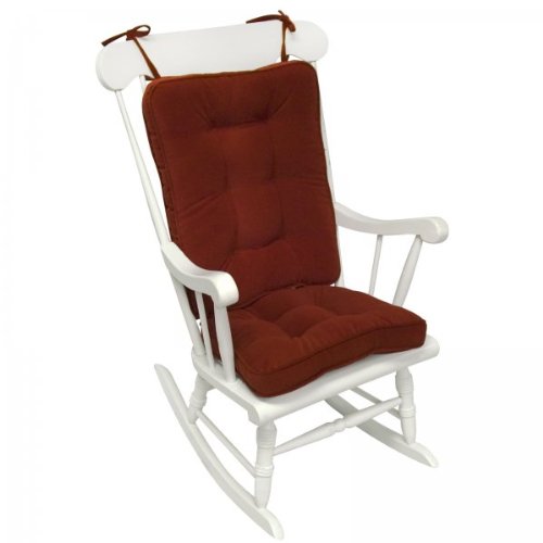 Solid color rocking chair cushion set. 100-Percent nylon microfiber fabric. This rocker cushion set is fully reversible. Set consists of two cushions; 1 seat cushion (17-Inch W by 15-Inch D) and 1 back cushion (17-Inch W by 22-Inch H). Cushion sets are 3-Inch thick. Cushions have a boxed, corded edge trim and 4 circle tacks. String ties are attached to the backs of both cushions. The rocker cushions are fully tufted and filled with 100-Percent polyester fiberfill. Home furnishings for indoor use.· Spot clean only. Made in the USA. (Cushions are + or – 1-1/2-Inch )