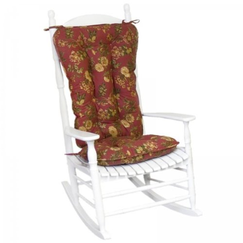 Classic floral rocking chair cushion set. 100-Percent cotton fabric. This rocker cushion set is fully reversible. Set consists of two cushions; 1 seat cushion (18-Inch W by 18-Inch D) and 1 back cushion (18-Inch W by 28-Inch H). Cushion sets are 3-Inch thick. Cushions have a bound edge trim and 4 circle tacks. String ties are attached to the backs of both cushions. The rocker cushions are fully tufted and filled with 100-Percent polyester fiberfill. Home furnishings for indoor use.· Spot clean only. Made in the USA. (Cushions are + or – 1-1/2-Inch )