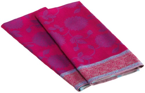 Mahogany's finest quality jacquard kitchen towels, with details that match the quality of any jacquard on the market today. The Pio Plum has a dark red center, with a contrasting stylized woven crysanthemum in purple. The border is a woven contrast to the center design in red and purple, so that the entire towel is a single piece of fabric, even though the border contrasts with a turquoise blue band. This towel is sold in pairs, and each measures 20-inches by 30-inches.